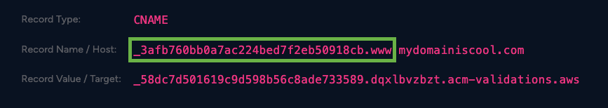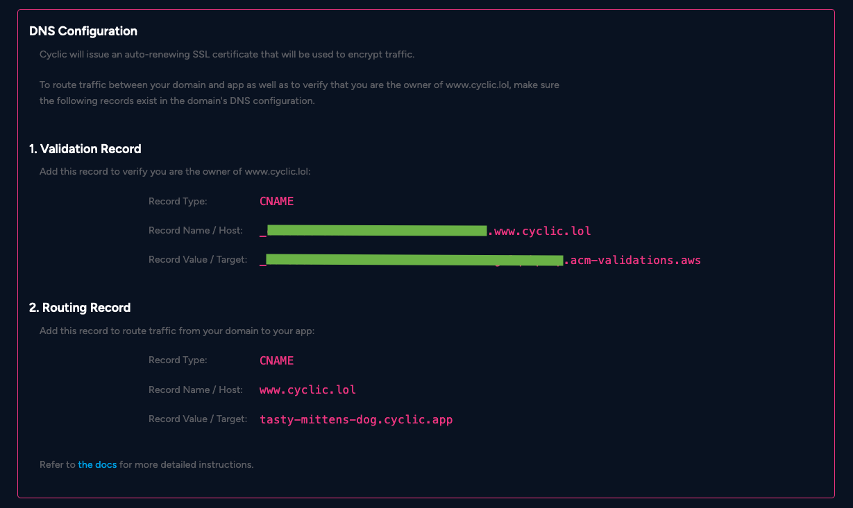 6. Once Cyclic has issued a DNS record for your domain, you will see a pink highlighted box appear below. There are two sections within this box: Validation Record and Routing Record.