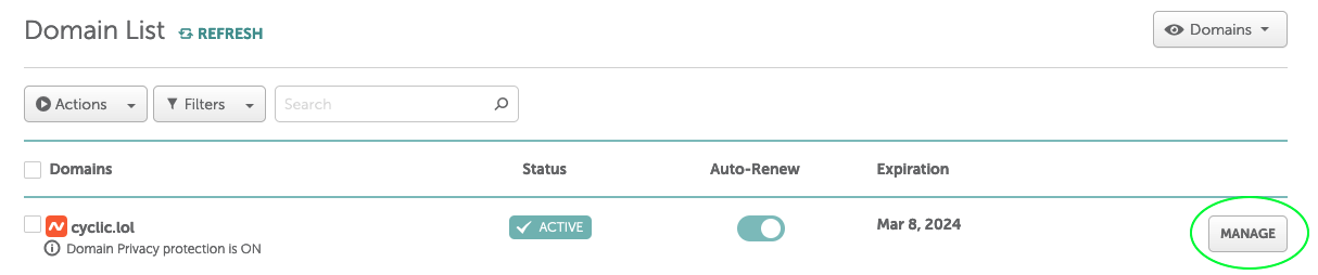 1. In Namecheap, select Domain List from the sidebar and click the Manage button next to your domain.