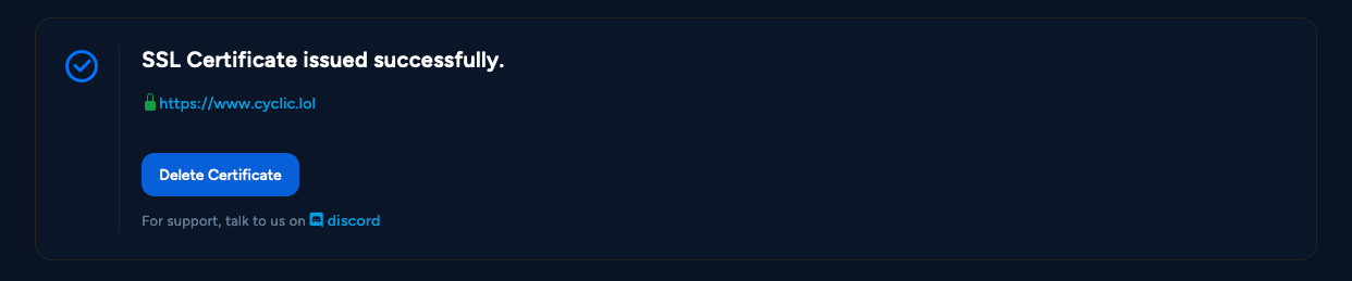 In Cyclic, you can check if you have completed the steps correctly. Below the pink DNS record section, there is a status box that will give you current information about your domain and SSL certificate. If you are uncertain, be sure to check here first.